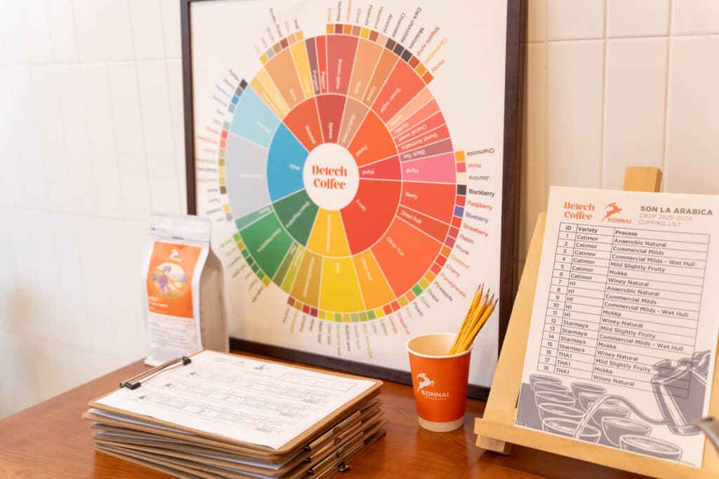 During the cupping session of Son La Arabica samples from the 2025–2026 crop, Detech Coffee recorded encouraging results, with 5 samples scoring from 86 points as evaluated by international CQI expert Manuel Diaz. The session clearly reflects the ongoing journey of improving coffee quality in Son La – from raw material development and processing techniques to long-term strategic direction.