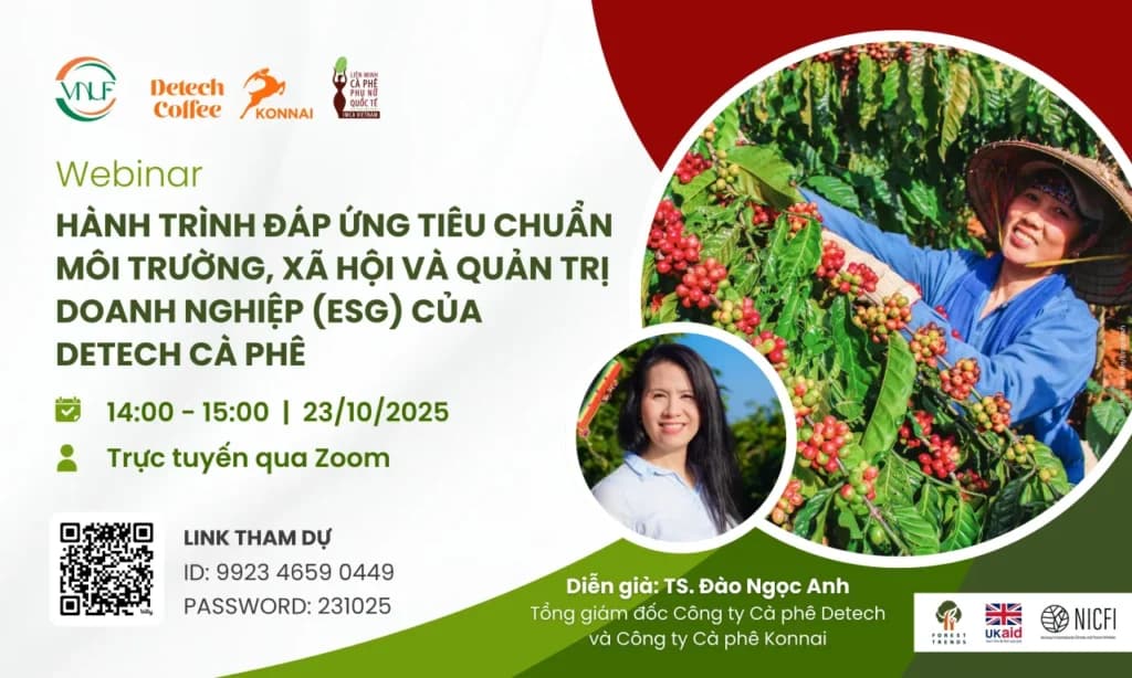 Tại Việt Nam, Detech Coffee là một trong những doanh nghiệp tiên phong biến các yêu cầu này thành động lực đổi mới mô hình sản xuất, hướng tới “cà phê phát thải thấp, bảo tồn thiên nhiên và tạo giá trị cộng đồng”. Câu chuyện này sẽ được chia sẻ trong webinar sắp tới: Hành trình đáp ứng tiêu chuẩn Môi trường, Xã hội và Quản trị doanh nghiệp (ESG) của Detech Coffee. Thông tin chi tiết về webinar như sau: